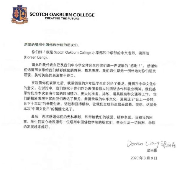 你 們 好 ! 我 是 Scotch Oakburn College 小 學 部 和 中 學 部 的 中 文 老 師 , 梁 雨 陽 ( Doreen Liang ) 。 請 允 許 我 代 表 自 己 及 我 們 中 小 學 全 體 師 生 向 你 們 道 一 聲 誠 摯 的 「 感 謝 ! 」 。 感 謝 你 們 遠 道 而 來 帶 給 我 們 精 彩 絕 倫 的 舞 獅 、 舞 龍 表 演 。 我 們 師 生 都 無 一 例 外 地 對 你 們 活 靈 活 現 、 美 輪 美 奐 的 表 演 讚 不 絕 口 。 在 觀 看 你 們 表 演 之 後 , 我 帶 領 我 的 六 年 級 學 生 們 討 論 了 舞 龍 、 舞 獅 在 中 華 文 化 中 的 意 義 。 在 討 論 中 , 我 們 驚 歎 於 你 們 作 為 表 演 者 驚 人 的 團 結 協 作 和 敬 業 精 神 。 我 們 感 恩 你 們 為 本 次 表 演 付 出 的 時 間 精 力 、 龐 大 的 準 備 、 排 練 、 道 具 服 裝 和 交 通 等 工 作 。 你 們 的 精 彩 表 演 不 僅 向 我 們 表 達 了 舞 龍 、 舞 獅 承 載 的 中 華 文 化 , 更 展 現 了 「 台 上 一 分 鐘 , 台 下 十 年 功 」 的 辛 勤 付 出 、 韌 勁 和 拚 搏 精 神 , 讓 我 們 全 校 師 生 倍 受 鼓 舞 。 我 想 , 這 就 是 本 次 「 中 國 文 化 日 」 的 精 髓 之 處 了 。 最 後 , 再 次 感 謝 你 們 的 無 私 奉 獻 , 和 帶 給 我 們 的 視 覺 、 精 神 享 受 。 我 和 我 的 同 事 、 學 生 們 衷 心 地 祝 願 每 一 位 塔 州 中 國 佛 教 學 院 的 朋 友 們 , 事 業 生 活 一 切 順 利 , 學 院 的 發 展 越 來 越 好 。