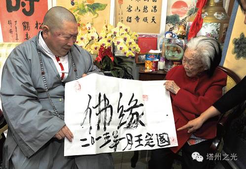 由 此 因 緣 , 四 年 前 , 我 拜 見 了 王 定 國 先 生 。 王 定 國 先 生 當 時 雖 已 104 歲 , 說 話 聲 音 洪 亮 , 中 氣 十 足 , 還 即 興 揮 毫 , 贈 我 墨 寶 《 佛 緣 》 , 音 容 宛 在 ……
