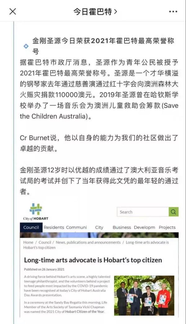 霍巴特署名網媒體[今日霍巴特]也報道了金剛聖源榮獲優秀公民獎事蹟。稱獲得最高榮譽稱號。