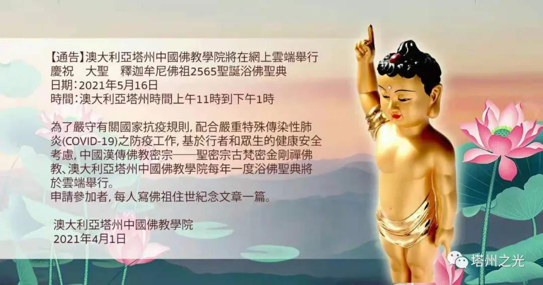 爲了嚴守有關國家抗疫規則,配合嚴重特殊傳染性肺炎(COVID-19)之防疫工作,基於行者和眾生的健康安全考慮,中國漢傳佛教密宗—聖密宗古梵密金剛禪佛教、澳大利亞塔州中國佛教學院每年一度浴佛聖典將於雲端舉行。