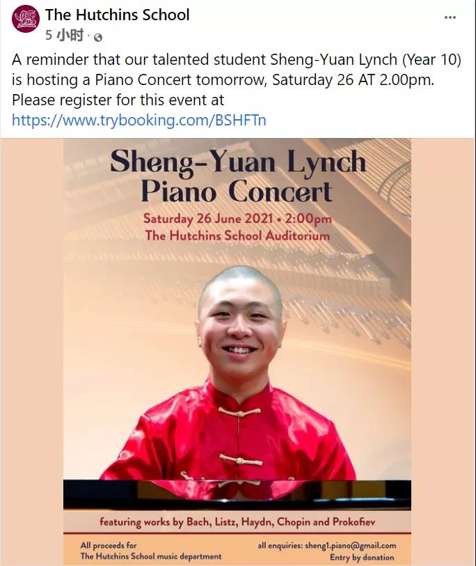 【轉載】Hutchins School學校音樂天才學生林聖源將在本週六舉辦一場鋼琴演奏會義演活動