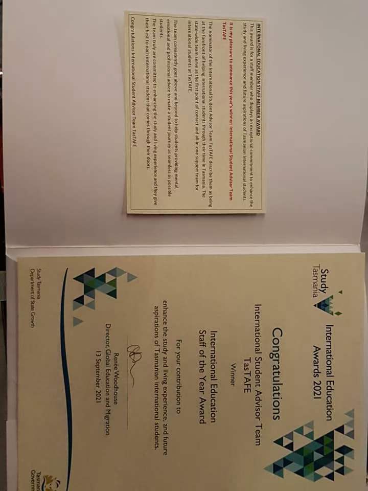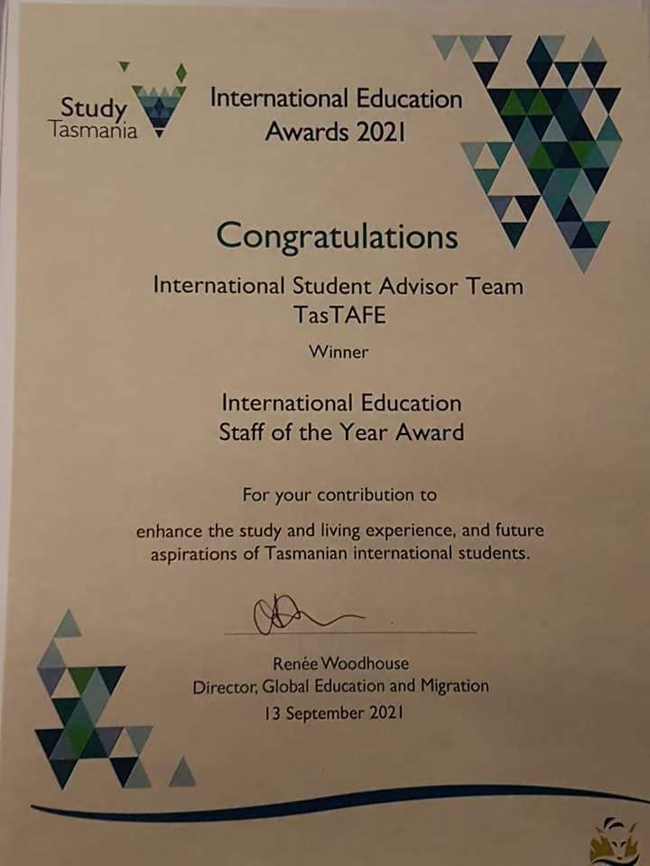 感恩 薄伽梵 智及維摩詰 師尊加持,昨天在2021年9月13日晚上弟子被邀請參加一年一度的《學習塔州國際教育獎》(英語是Study Tasmania International Education Awards)的頒獎晚會。今天TasTAFE 又非常成功,贏得了三個獎項,而其中是弟子TasTAFE 國際學生顧問的團隊贏得2021年塔州國際教育員工獎(英語是2021 Tasmanian International Education Staff Award)。