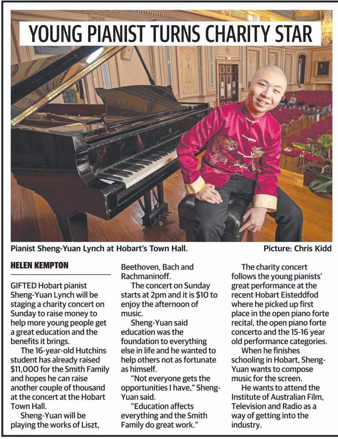 金剛聖源的慈善鋼琴音樂會將在本週日—2021年10月31日於霍巴特市政廳舉行。他將會演奏巴赫、貝多芬和李斯特等的作品。