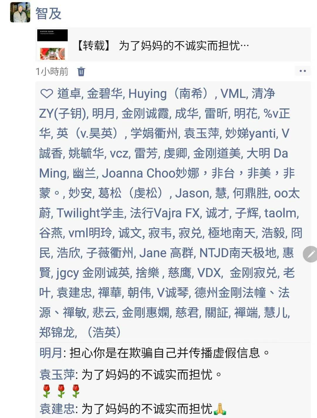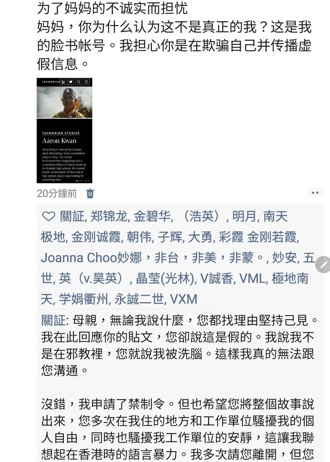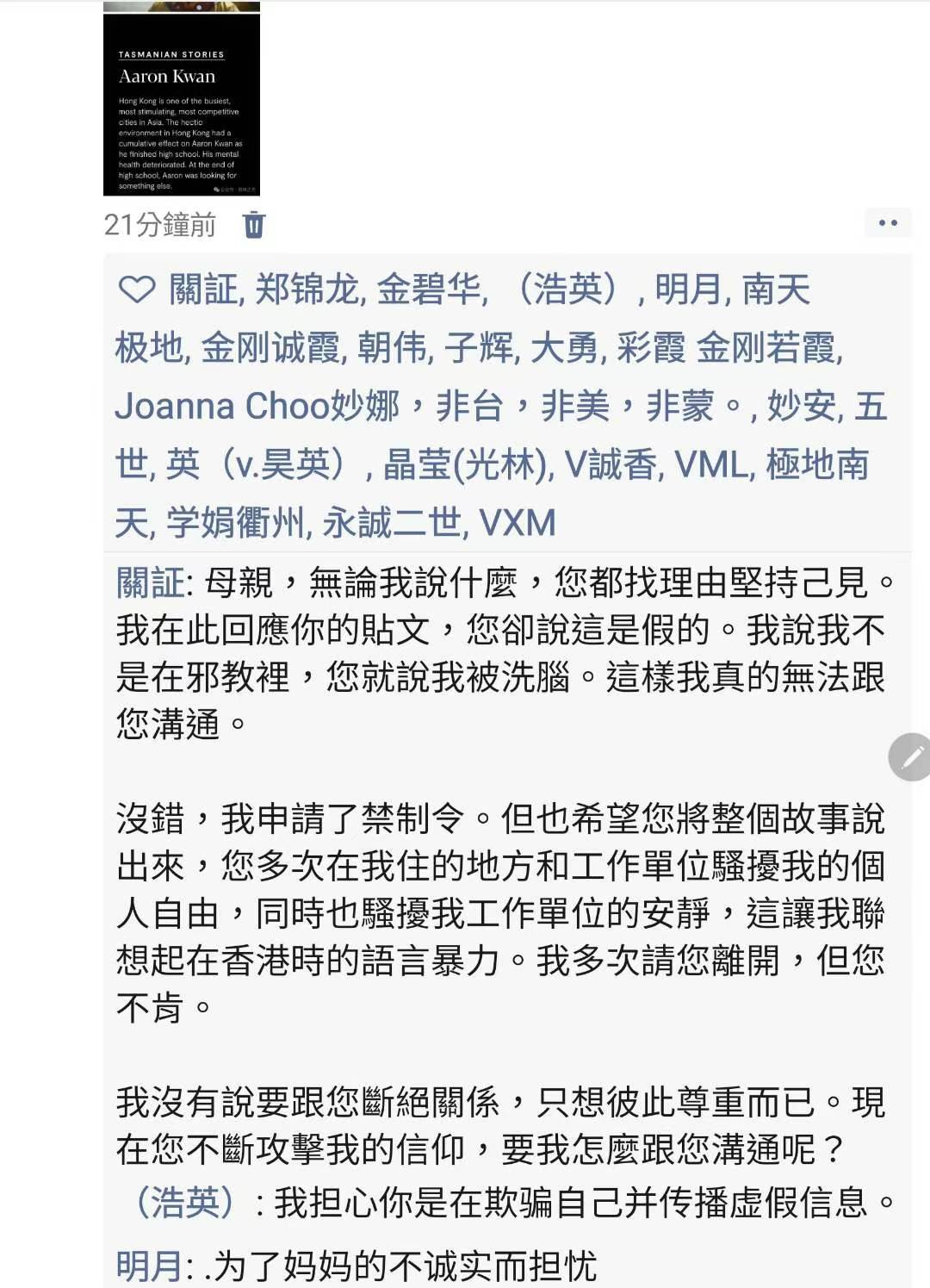 以和为尊,尊重事实。 母亲,无论我说什么,你都找理由坚持己见。我在此声明这是回应你的贴文,你却说这是假的。我说我不是在邪教里,你就说我被洗脑。这样我真的无法跟你沟通。 没错,我申请了禁制令。但也希望你将整个故事说出来,你多次在我住的地方和工作单位骚扰我的个人自由,同时也骚扰我工作单位的安静,这让我联想起在香港时的语言暴力。我多次请你离开,但你不肯。 我没有说要跟你断绝关系,只想彼此尊重而已。现在你不断攻击我的信仰,要我怎么跟你沟通呢? ![]() ![]() ![]() ![]() Copyright © 1991- Jin-Gang-Dhyana Incorporated ![]() |