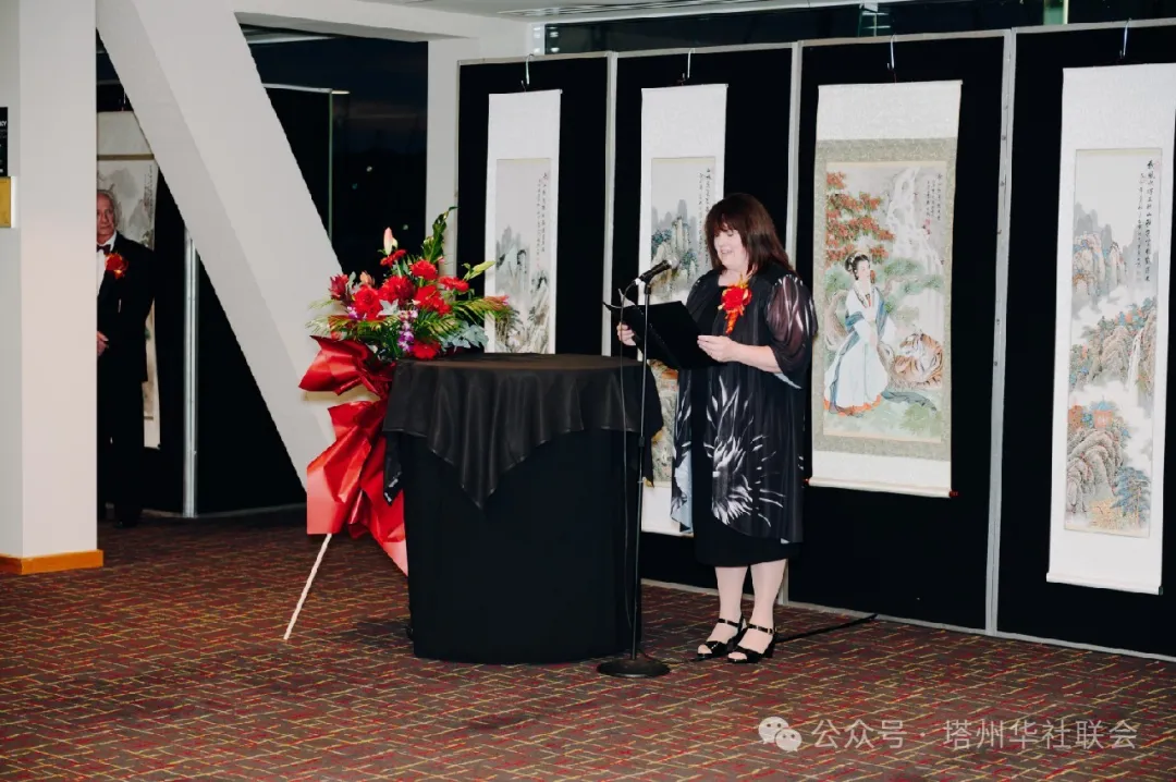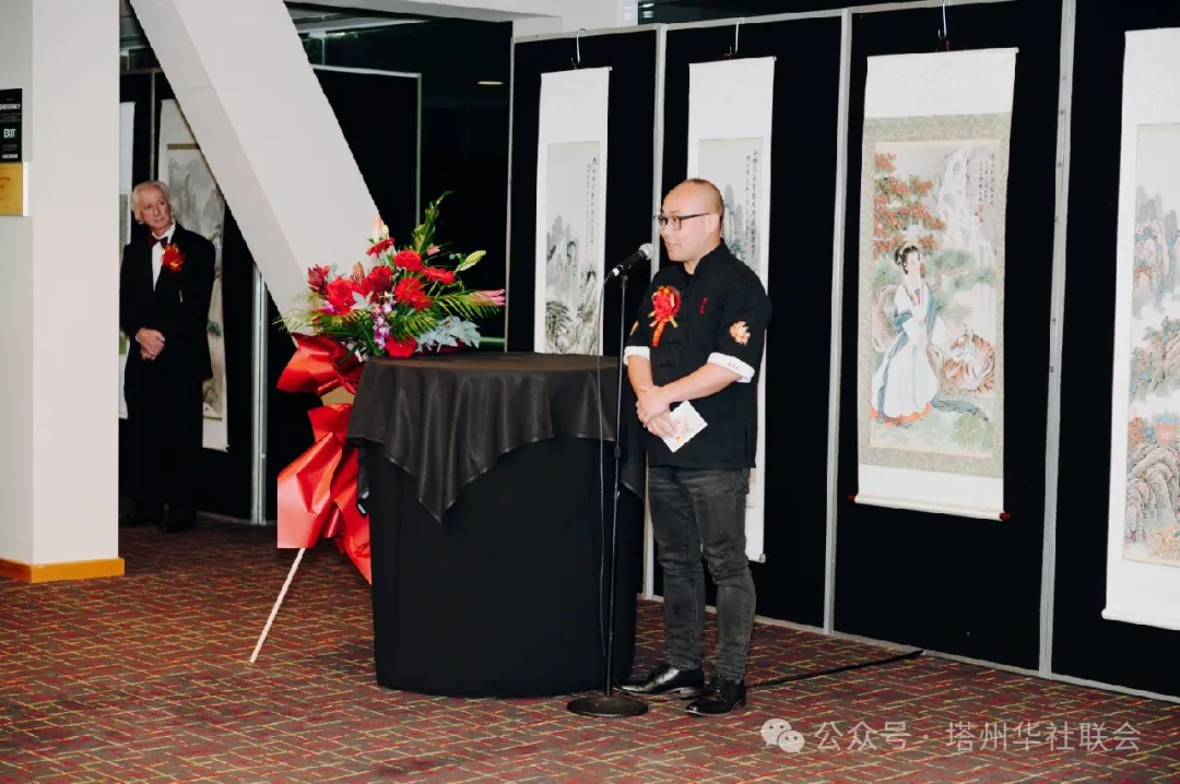 華聯會秘書長代表協會致辭歡迎到場的賓客們,徐哲秘書長引用當地說法,〝a picture worths a thousand words 〞一幅畫作勝過千言萬語,秦生老師不遠萬里帶來的上百幅書法畫作,用實際行動向世界展示中華傳統文化的深厚內涵,彰顯堅定的中華文化立場和文化自信;並向各位前來支援的表演團隊,佈展人員,社區志願者給予了認可和鳴謝,肯定了華人社區團結的力量可以戰勝任何挑戰,更呼應了塔州華聯會成立之初的宗旨〝和諧,團結,互助,共尊〞,積極促進中澳兩國人民友誼,推動中澳兩國經濟文化交流,協助華人融入當地主流社會。
