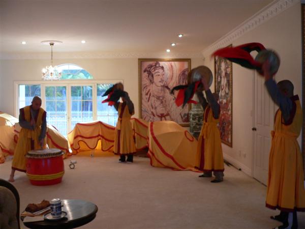 日 , 聖 密 上 師 們 於 金 剛 聖 天 寺 , 阿 達 爾 嘛 佛 曼 陀 羅 聖 壇 , 操 持 法 器 奏 響 皇 家 國 師 聖 密 儀 規 鼓 樂 。
