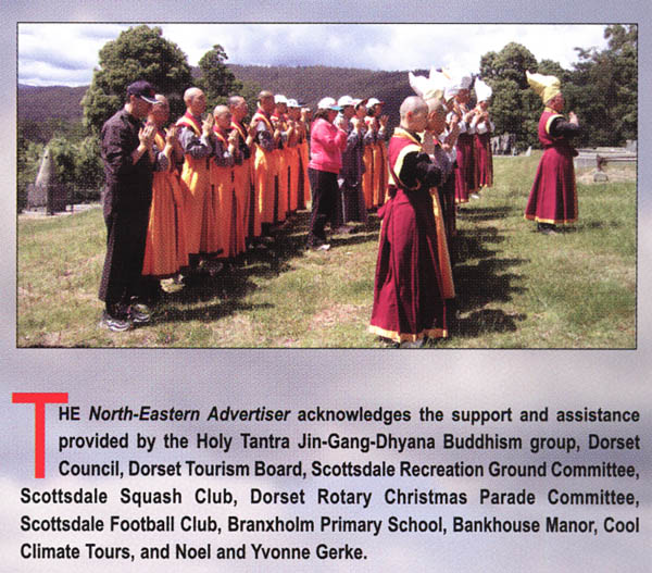 | 《 North Eastern Advertiser 》 鸣 谢 圣 密 宗 金 刚 禅 佛 教 、 Dorset 区 市 政 局 、 Dorset 区 旅 游 局 、 Scottsdale 游 乐 场 委 员 会 、 Scottsdale 壁 球 俱 乐 部 、 Dorset 区 扶 轮 社 圣 诞 游 行 委 员 会 、 Scottsdale 足 球 俱 乐 部 、 Branxholm 小 学 、 Bankhouse 庄 园 、 Cool Climate 旅 游 公 司 , 和 Noel 及 Yvonne Gerke 所 提 供 的 支 持 与 协 助 。 |