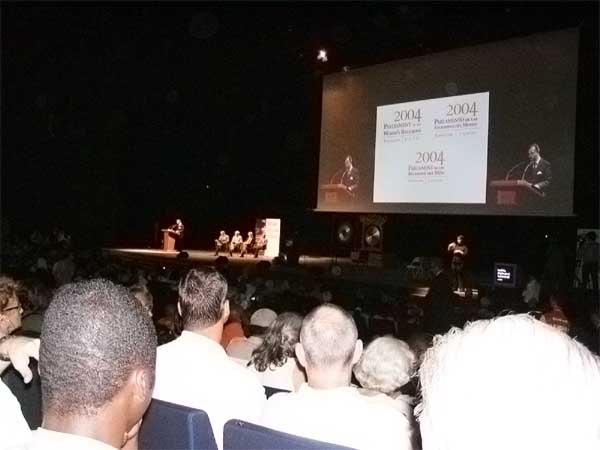 七 月 七 日 下 午 五 时 , 大 会 在 会 展 中 心 的 演 讲 厅 举 行 开 幕 典 礼 , 可 容 纳 三 千 二 百 人 的 主 会 场 座 无 虚 席 。 世 界 宗 教 国 会 巴 塞 隆 拿 程 序 委 员 会 主 席 之 一 , 拥 多 个 博 士 学 位 及 受 聘 于 多 间 著 名 大 学 的 教 授 Dr. Raimon Panikkar , 作 为 开 幕 典 礼 主 讲 者 向 与 会 者 致 词 。