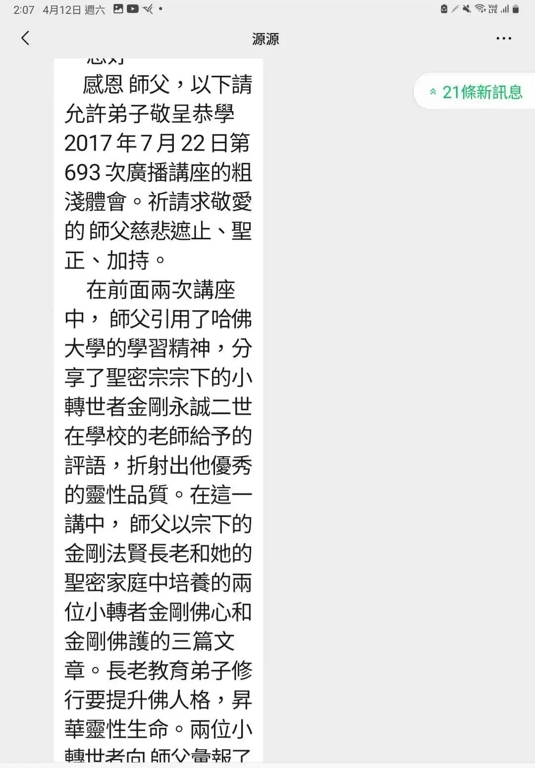 在前面兩次講座中, 師父引用了哈佛大學的學習精神,分享了聖密宗宗下的小轉世者金剛永誠二世在學校的老師給予的評語,折射出他優秀的靈性品質。在這一講中, 師父以宗下的金剛法賢長老和她的聖密家庭中培養的兩位小轉世者金剛佛心和金剛佛護的三篇文章。長老教育弟子修行要提升佛人格,昇華靈性生命。兩位小轉世者向 師父彙報了(略)