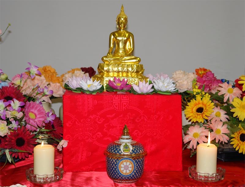 | The golden Buddha statue and treasure vase, presented by the Princess of Thailand, are reverently enshrined in the Holy Mandala of the World Headquarters of Holy Tantra Jin-Gang-Dhyana Buddhism. |