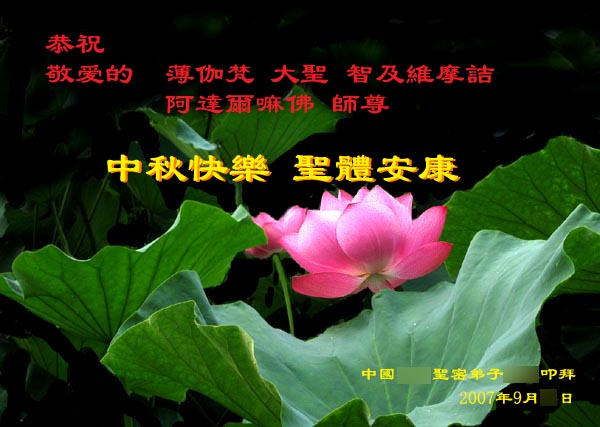 薄 伽 梵 大 圣 智 及 维 摩 诘 阿 达 尔 嘛 佛 师 尊 的 慈 悲 加 持 和 遮 止 , 在 这 金 秋 佳 节 来 临 之 际 , 弟 子 深 深 祝 福
