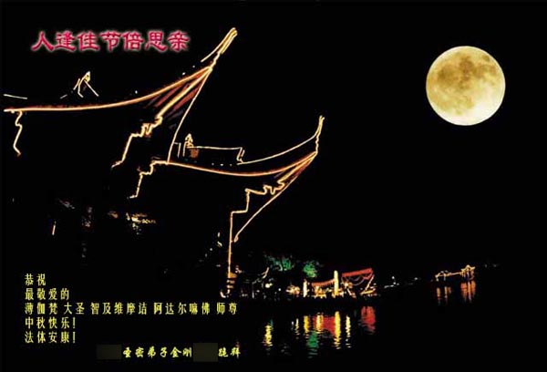 今 天 是 祖 国 的 传 统 节 日 ── 中 秋 节 , " 每 逢 佳 节 倍 思 亲 " ! 弟 子 在 您 的 故 乡 , 遥 祝 您 中 秋 节 日 快 乐 ! 法 体 安 康 ! 特 呈 上 中 秋 贺 卡 , 以 表 思 念 之 情 !