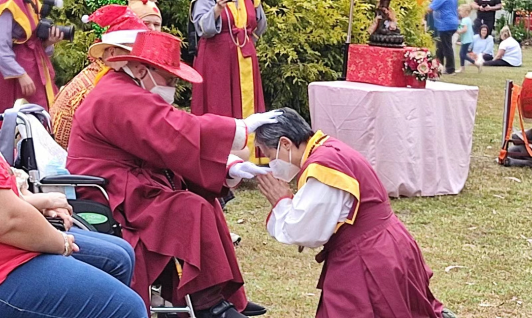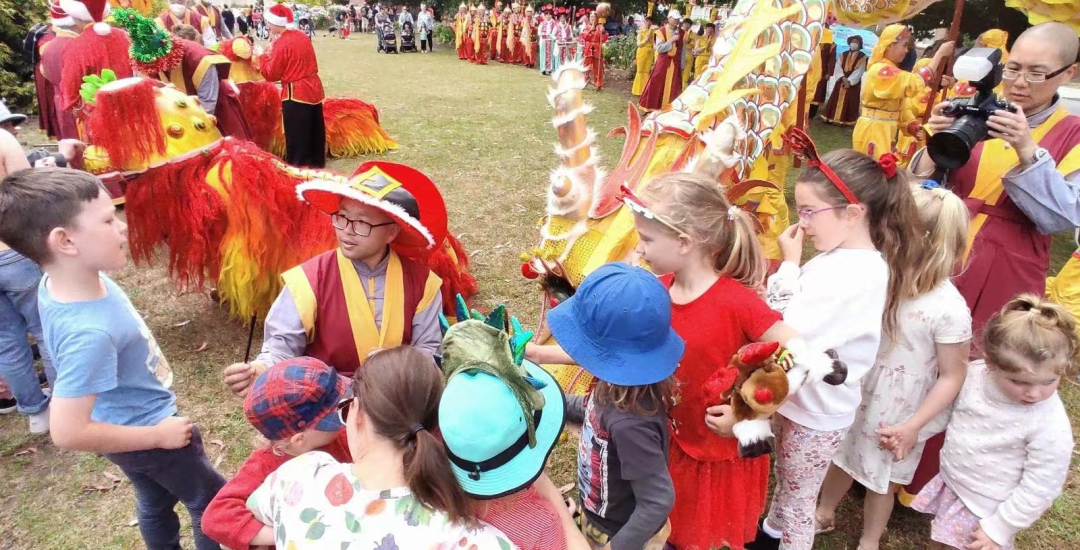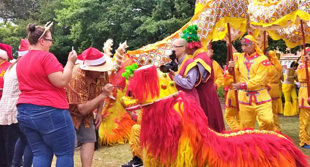 我們帶來了中國的文化,帶來了中澳建交五十週年以來的友誼 金剛慈鷹 聖誕遊行開始前,將舉行傳統的聖密儀規,這是源自古天竺、源自皇宮內道場傳承至今的靈性文化傳承,這是稀有難得文化傳承,如今能公開在民眾面前進行,確實是難得一見的非物質文化遺產,值得當今人們的禮遇和珍惜! 首先介紹貴賓、禮讚國家和原住民,接著,金剛紅淨長老宣佈聖密舞龍舞獅點睛儀規正式開始, 薄伽梵 師尊首先致歡迎辭。 薄伽梵 師尊飽含著對眾生的慈悲、智慧和靈性大愛致歡迎辭: