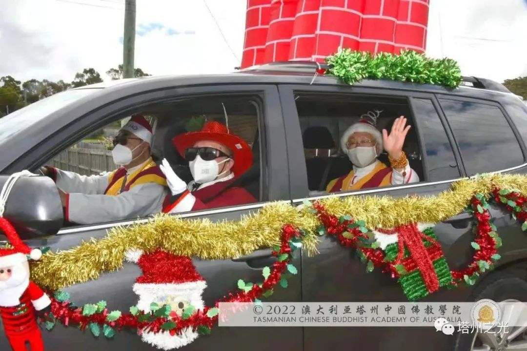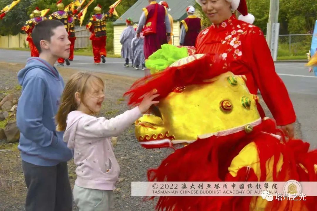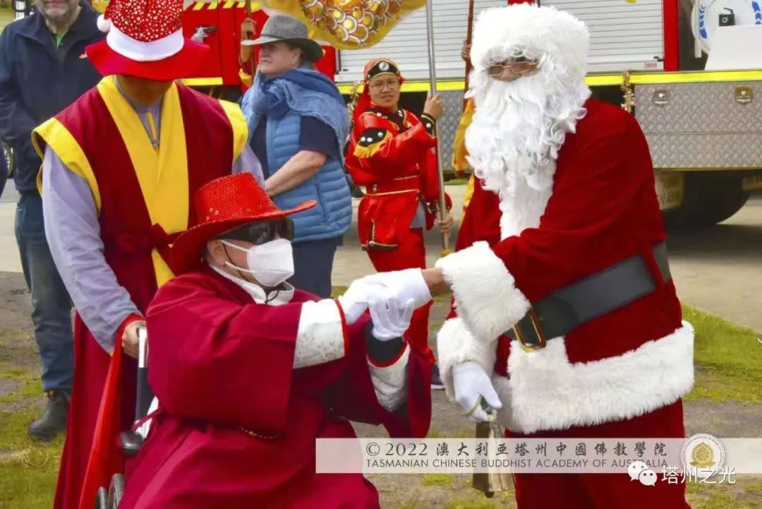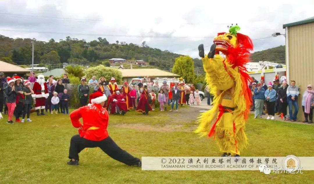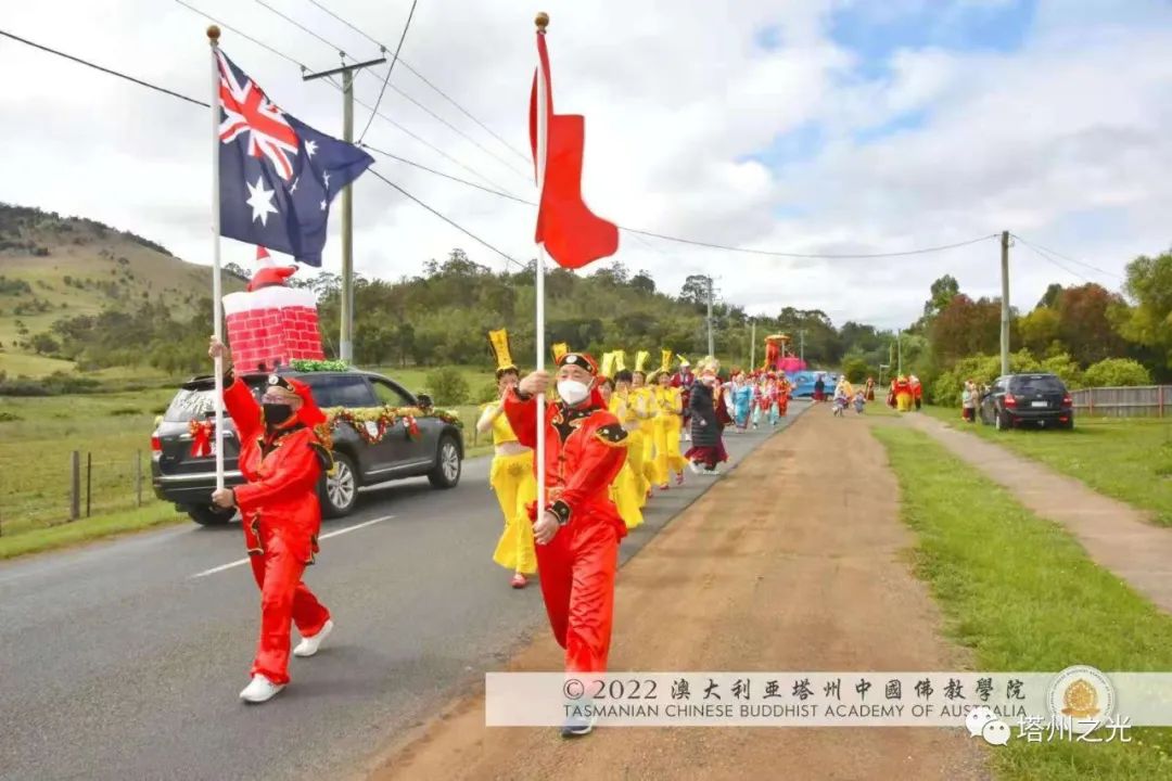 中國精神 自信自強 生機盎然 澳大利亞塔州中國佛教學院,在每年聖誕巡禮的聖密曼荼羅方陣,皆以聖密長老執持中國、澳洲國旗並肩同行,喻意佛學院以平穩踏實的腳步,緊隨母親的呼喚,顯微闡幽,義不容辭,積極推動中國精神靈性文化,邁出祖國文化自信,民族自豪,不卑不亢的步伐,實踐「內心謙下(是功),外行於禮(是德)」的普敬價值。 事實證明,不同文化的交流,能夠促進和諧,促進世界和平,促進世代友好發展。 在舉國歡慶的耶誕月,一週之內, 薄伽梵 智及維摩詰 師尊三度受塔州各市政府之邀參加年度慶祝活動,此三座衛星城鎮分別位於: