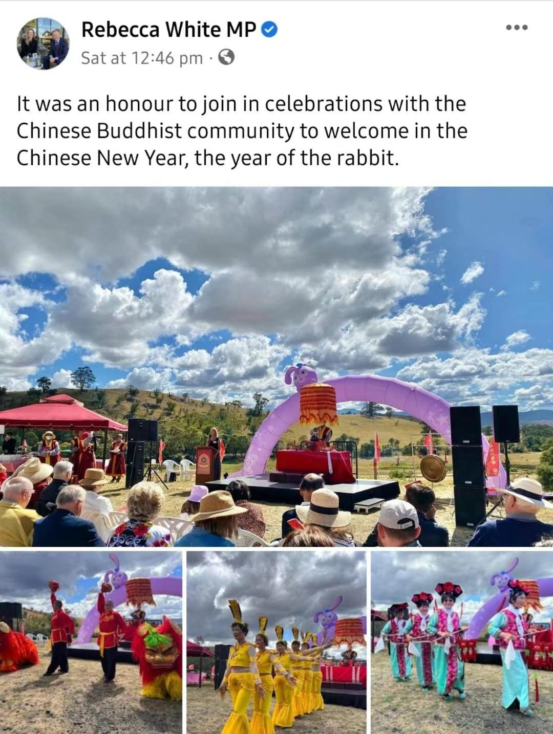 塔州反對黨領袖Rebecca White 的臉書轉發:我很榮幸能與中國佛教社團一起慶祝中國農曆新年—兔年