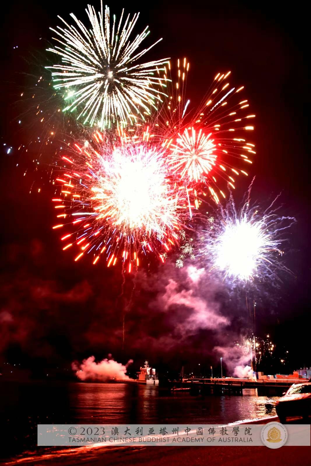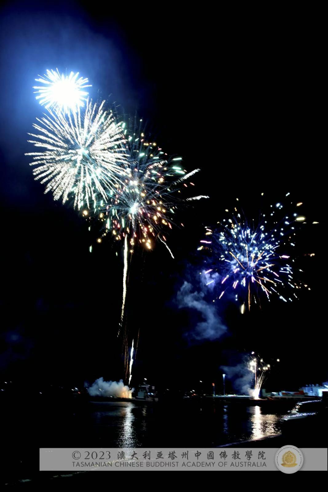 今年 令閤家老幼為之興奮雀躍的更有晚上的海上煙火秀。 聲聲巨響,伴隨著破空長音,光點衝上雲霄!金黃、銀白、翠綠、海藍、瑰紅的火花,在夜空中,似孔雀開屏,花雨綻放,時而旋轉,時而跳躍,在黑暗中爭妍鬥豔,顯示著生命的讚歎、生命的喜悅、生命的光芒和生命的宇宙規律。煙火秀隨著煙火散落而圓滿結束。 薄伽梵 智及維摩詰 師尊曾聖密龍講: