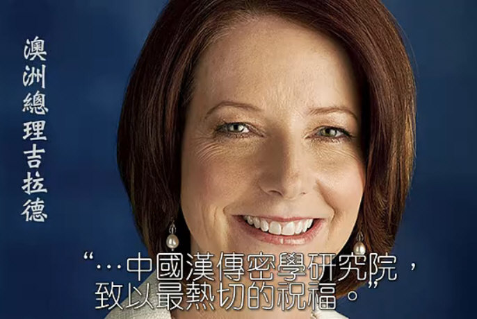 台 上 的 发 言 , 首 先 发 言 的 是 澳 洲 的 总 理 Honourable Julia Gillard PM 给 中 国 汉 传 密 宗 ── 圣 密 宗 金 刚 禅 佛 教 、 给 中 国 汉 传 密 学 研 究 院 发 来 了 庆 祝 迎 接 蛇 年 和 欢 送 龙 年 的 贺 信 。 总 理 , 澳 洲 的 总 理 Honourable Julia Gillard PM 说 :