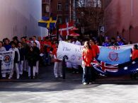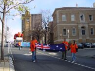 在 澳 洲 國 旗 及 聖 密 宗 金 剛 禪 佛 教 宗 旗 的 引 領 之 下 , 遊 行 隊 伍 在 Hobart 主 要 街 道 巡 遊
