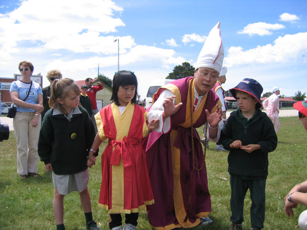 Rebecca Irwin of Scottsdale and William Lloyd of Branxholm listen intently as the significance of the Dragon dance is explained by one of the visiting Elder Gurus.