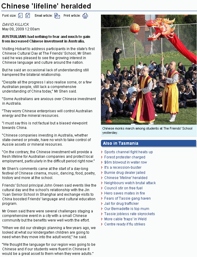 金 剛 禪 國 際 總 會 國 際 互 聯 網 官 方 網 站 《 金 剛 禪 世 界 》 記 者 團 注 意 到 塔 州 主 要 報 刊 《 水 銀 報 》 對 於 中 國 駐 澳 洲 Melbourne 領 事 館 的 沈 總 領 事 訪 問 塔 州 的 報 導 , 該 文 主 要 報 導 了 沈 總 領 事 在 塔 州 弗 萊 德 學 校 的 即 席 演 說 。 本 文 是 《 水 銀 報 》 關 於 沈 先 生 到 訪 皞 峇 燈 , 向 弗 萊 德 學 校 舉 行 的 塔 州 首 屆 中 國 文 化 日 的 參 與 者 致 詞 的 中 文 翻 譯 。 http://www.themercury.com.au/article/2009/05/09/72021_tasmania-news.html 該 報 導 是 《 水 銀 報 》 記 者 DAVID KILLICK 撰 寫 , 於 May 09, 2009 12:00am《 水 銀 報 》 國 際 互 聯 網 配 圖 發 表 。