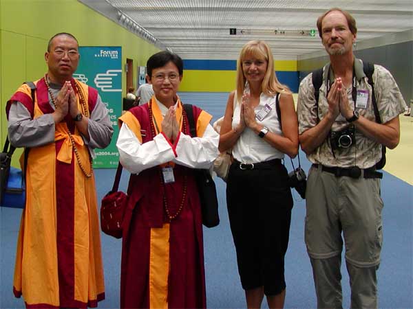金 刚 永 爱 长 老 和 金 刚 禅 成 上 师 与 美 国 夫 妇 一 起 合 十 留 念
