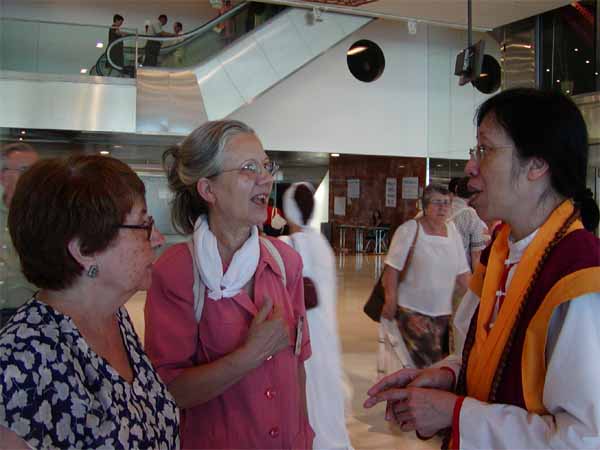 巴 塞 隆 拿 市 民 广 泛 关 注 2004 世 界 宗 教 国 会 会 议 的 顺 利 召 开 , 图 为 金 刚 禅 彰 长 老 向 两 位 巴 塞 隆 拿 当 地 女 仕 作 随 缘 开 示 。