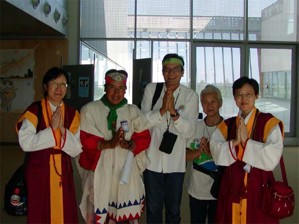 毗 卢 遮 那 大 日 之 光 遍 照 五 大 洲 众 生 ── 五 位 参 加 2004 世 界 宗 教 国 会 的 代 表 合 影 留 念 。 他 们 分 别 来 自 于 亚 洲 、 美 洲 、 欧 洲 、 非 洲 和 大 洋 洲 ( 从 左 至 右 ) 。