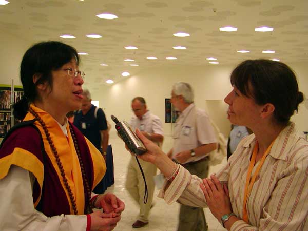把 大 圣 释 迦 牟 尼 佛 极 终 善 性 的 慈 悲 和 智 慧 安 住 于 众 生 心 间 ── 金 刚 禅 彰 长 老 接 受 The World Peace Flame ( 世 界 和 平 火 焰 ) 的 英 国 女 会 员 Ms. Julie Mokhleiss 访 问 。