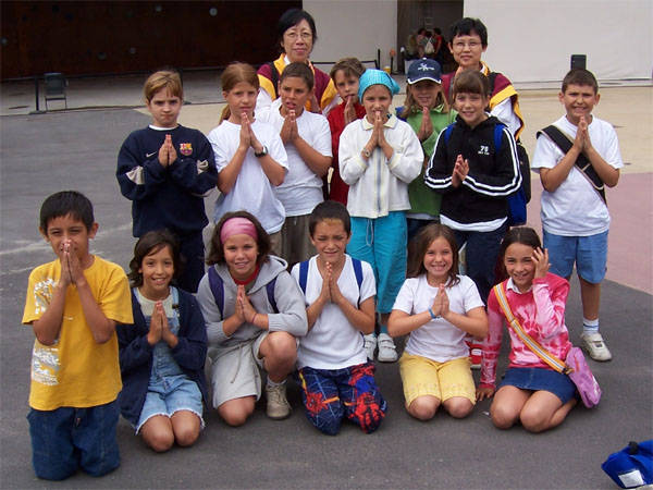 您 们 好 ! ── 圣 密 长 老 们 体 现 大 圣 释 迦 牟 尼 佛 祖 极 终 善 性 的 慈 悲 和 智 慧 的 外 皇 内 圣 之 威 仪 , 打 动 了 小 学 生 们 的 心 , 小 学 生 们 绽 开 灿 烂 的 笑 容 , 与 圣 密 长 老 们 合 照 。