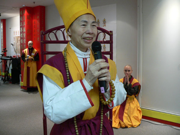 “ 我 宣 布 , 浴 佛 圣 典 正 式 开 始 ! ” 最 受 尊 敬 的 金 刚 惠 兰 长 老 为 浴 佛 圣 典 敲 响 第 一 声 法 锣 。