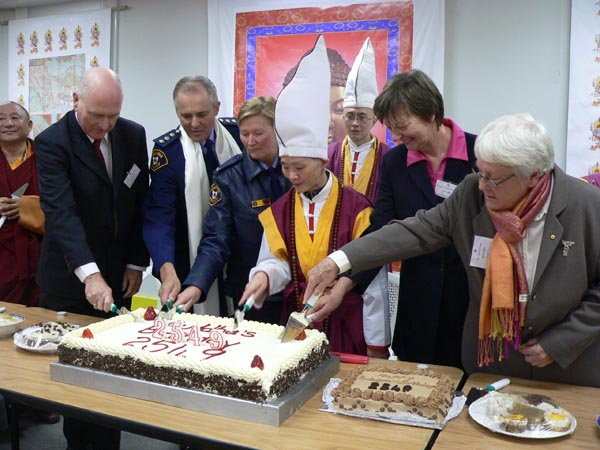 金 刚 法 莲 长 老 和 诸 位 贵 宾 共 同 主 持 切 蛋 糕 仪 式 。