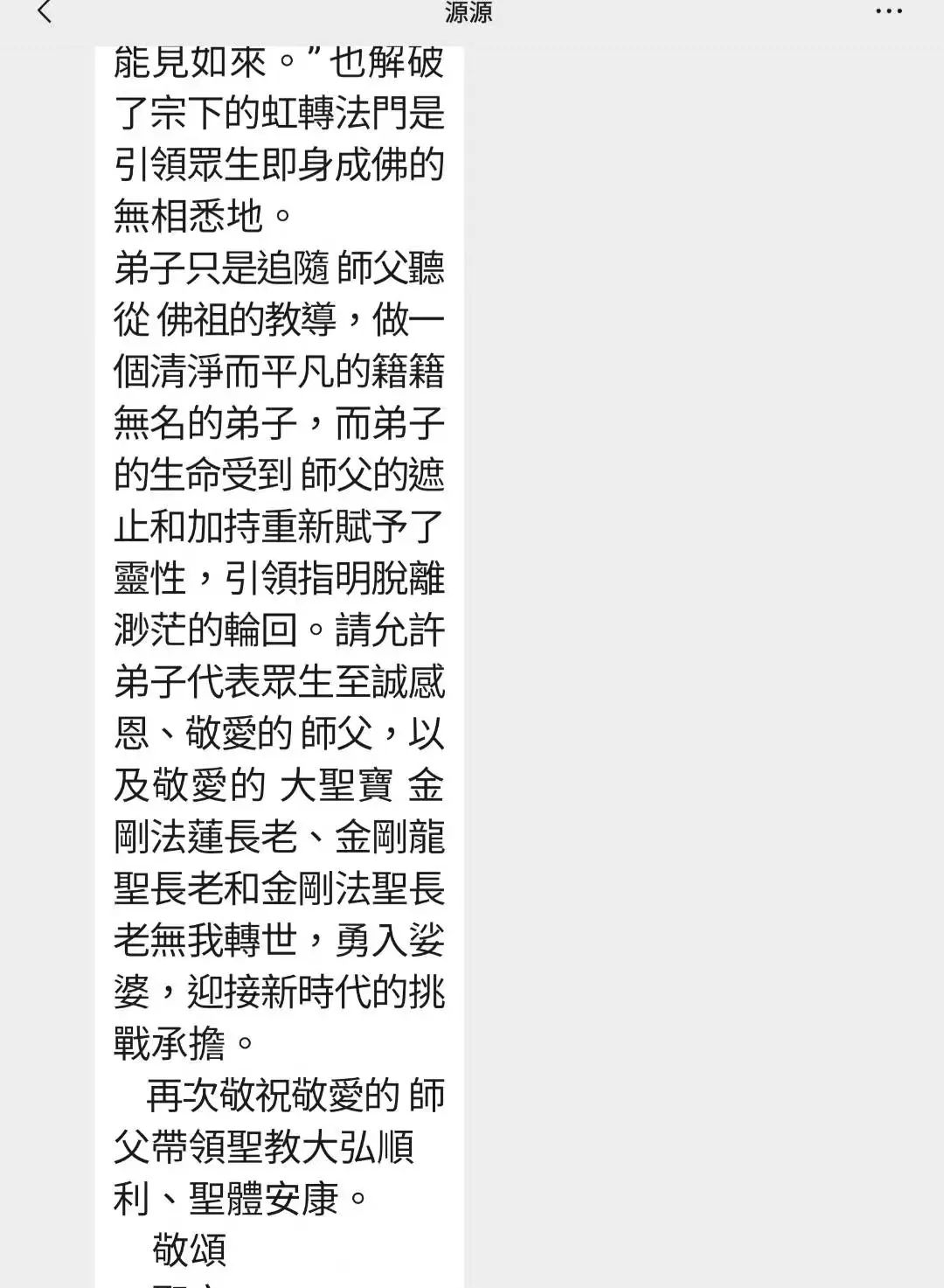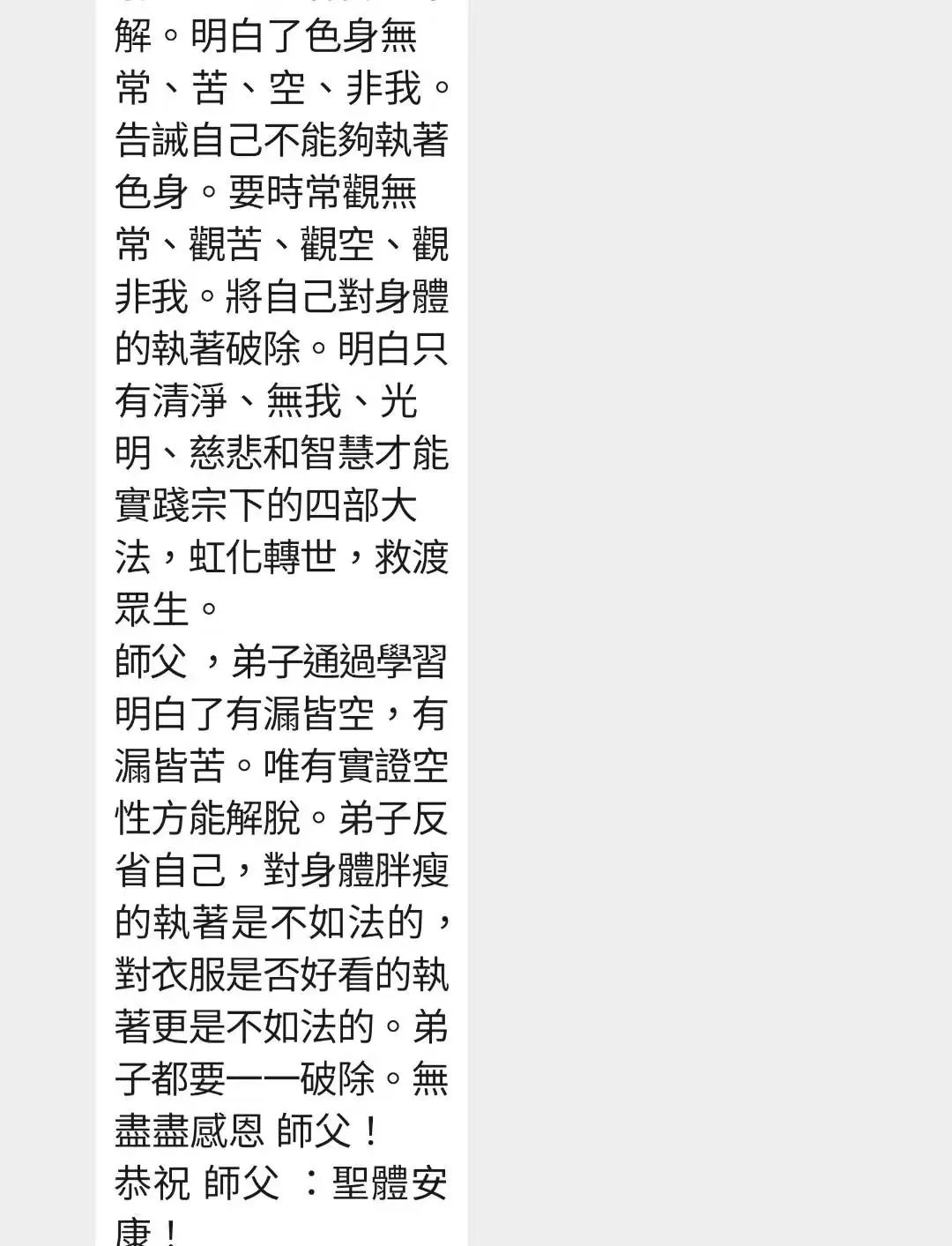 [梵花 弟子只是追随 师父,听从 佛祖的教导,做一个清净而平凡的籍籍无名的弟子,而弟子的生命受到 师父的遮止和加持重新赋予了灵性,引领指明脱离渺茫的轮回。请允许弟子代表众生至诚感恩敬爱的 师父,以及敬爱的 大圣宝 金刚法莲长老、金刚龙圣长老和金刚法圣长老无我转世,勇入娑婆,迎接新时代的挑战承担。 师父,弟子通过学习明白了有漏皆空、有漏皆苦。唯有实证空性方能解脱。弟子反省自己,对身体胖瘦的执着是不如法的,对衣服是否好看的执着更是不如法的。弟子都要一一破除。无尽尽感恩 师父!