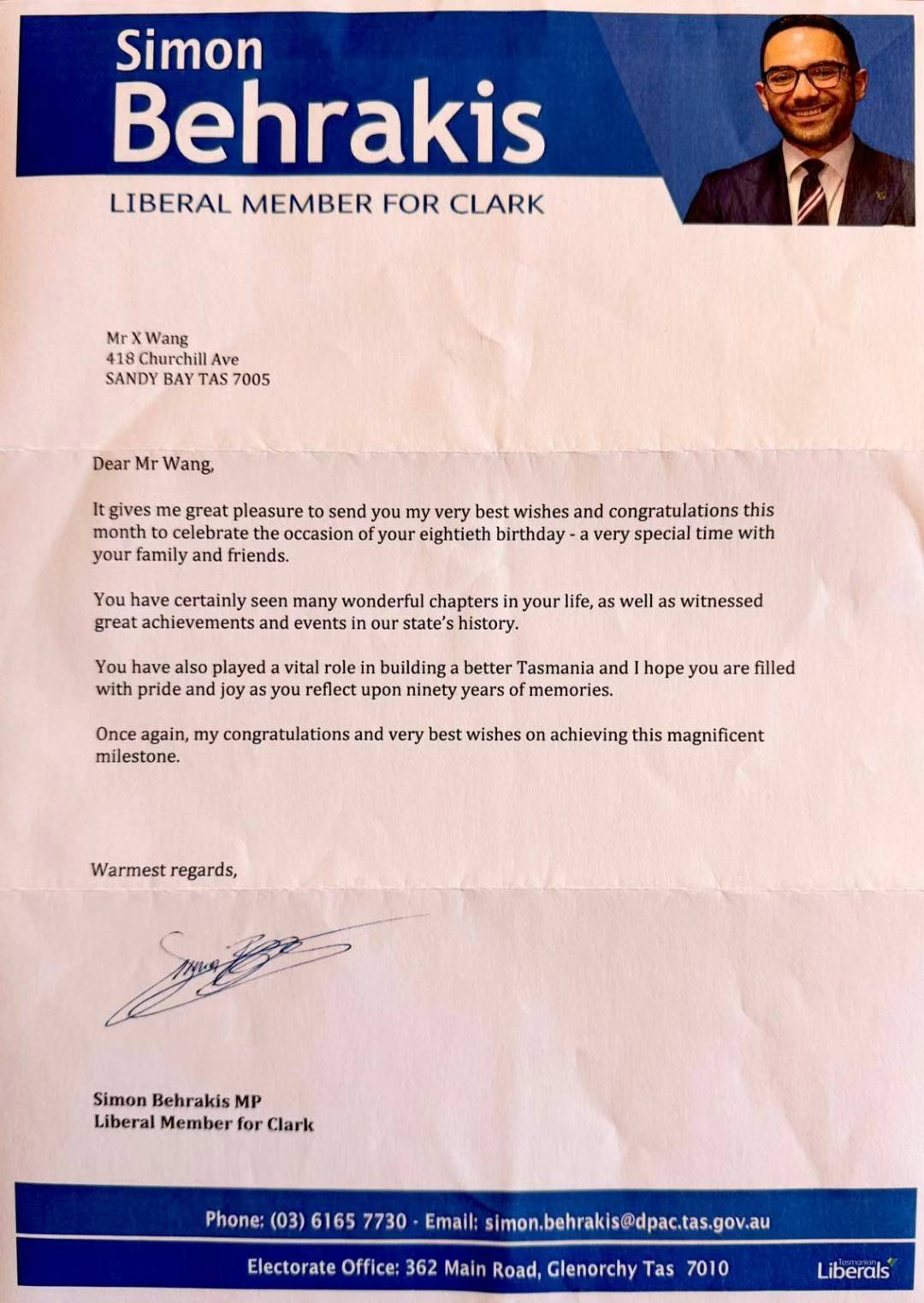 王先生启 亲爱的王先生: 我非常高兴在您八十华诞之际,致上最诚挚的祝贺与良好祝愿,与您及家人朋友一同庆祝这个特别的重要时刻。 您一生阅历丰富,不仅亲身经历了许多人生精彩篇章,也见证了我们州历史上的重大成就与事件。 您亦为建设更美好的塔斯马尼亚贡献良多,相信当您回顾这几十年来的点滴回忆时,必定感到无比的自豪与喜悦。 再次恭贺您达成如此非凡的里程碑,并致上我最诚挚的祝福。 最诚挚的问候!