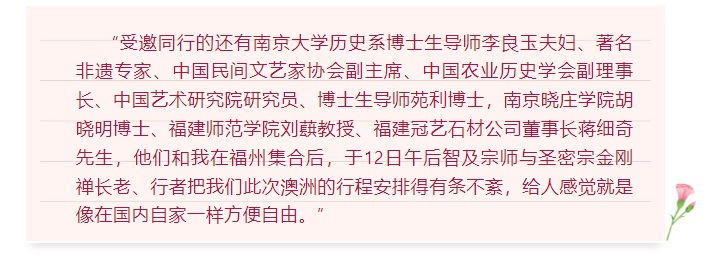 受邀同行的还有南京大学历史系博士生导师李良玉夫妇、著名非遗专家、中国民间文艺家协会副主席、中国农业历史学会副理事长、中国艺术研究院研究员、博士生导师苑利博士,南京晓庄学院胡晓明博士、福建师范学院刘蕻教授、福建冠艺石材公司董事长蒋细奇先生,他们和我在福州集合后,于12日午后 智及宗师与圣密宗金刚禅长老、行者把我们此次澳洲的行程安排得有条不紊,给人感觉就是像在国内自家一样方便自由。