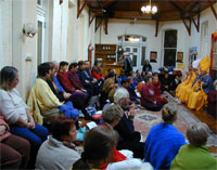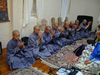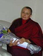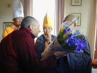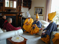 圣 密 宗 世 界 总 部 接 到 了 安 排 女 尼 Ven. Tenzin Palmo 来 访 塔 州 的 有 关 组 织 诚 恳 的 书 面 邀 请 , 作 了 慎 重 的 研 究 。 尽 管 圣 密 宗 世 界 总 部 正 处 于 封 山 ( 闭 关 ) 期 间 , 考 虑 到 邀 请 组 织 的 诚 意 、 Ven. Tenzin Palmo 在 大 雪 山 闭 关 十 二 年 艰 苦 的 行 持 、 加 上 她 是 一 位 继 续 米 勒 日 巴 的 传 统 、 噶 举 巴 的 女 尼 , 所 以 , 圣 密 宗 世 界 总 部 遵 照圣 智 及 维 摩 诘 王 信 得 师 尊 的 指 示 , 派 出 金 刚 永 乐 为 团 长 、 金 刚 永 明 和 金 刚 妙 果 为 副 团 长 。 由 三 名 长 老 带 领 及 六 位 上 师 协 同 的 、 共 有 十 五 位 僧 伽 组 成 的 代 表 团 , 于 六 月 廿 五 日 星 期 日 , 专 程 到 Deloraine 参 加 欢 迎 女 尼 Ven. Tenzin Palmo 的 聚 会 。