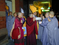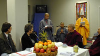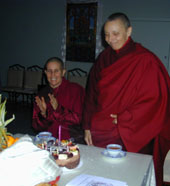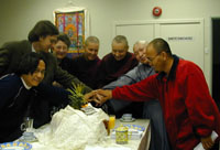 圣 智 及 维 摩 诘 、 我 们 的 阿 达 尔 嘛 佛 师 尊 以 及 女 尼 Venerable Tenzin Palmo 的 主 持 下 , 全 体 的 嘉 宾 一 起 切 生 日 蛋 糕 。 |