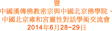 中 国 汉 传 密 学 研 究 院 第 六 届 学 术 研 讨 会 暨 中 国 汉 传 佛 教 密 宗 与 中 国 佛 学 院 、 中 国 北 京 雍 和 宫 灵 性 对 话 学 术 交 流 会 , 于 2014 年 6 月 28 ~ 29 日 殊 胜 举 行 。 今 天 , 中 国 汉 传 密 学 研 究 院 教 学 大 楼 一 楼 阿 丝 律 耶 宫 , 多 彩 、 亮 丽 、 喜 悦 、 吉 祥 、 庄 严 、 殊 胜 :