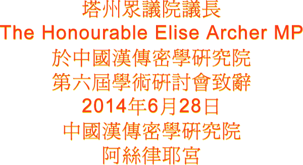 ( 翻 译 注 : 开 场 白 是 回 应 司 仪 介 绍 , The Honourable Elise Archer 多 次 作 为 贵 宾 莅 临 中 国 汉 传 密 宗 -- 圣 密 宗 金 刚 禅 佛 教 法 会 , 对 中 国 汉 传 密 宗 -- 圣 密 宗 金 刚 禅 佛 教 的 音 乐 是 非 常 熟 悉 , 可 以 单 独 为 大 家 演 奏 ) 首 先 我 希 望 答 谢 在 座 诸 位 贵 宾 , 特 别 是 远 道 而 来 , 从 澳 洲 大 陆 , 以 及 海 外 到 来 的 贵 宾 。 能 在 这 里 看 到 海 外 的 客 人 , 特 别 是 从 中 国 而 来 的 客 人 是 很 美 好 的 。 请 让 我 为 塔 州 州 长 The Honourable Will Hodgman MP 代 为 致 歉 不 能 出 席 。 他 现 时 在 澳 洲 大 陆 与 澳 洲 总 理 一 起 。 从 王 大 师 的 发 言 中 , 我 知 道 了 二 位 ( 指 澳 洲 总 理 以 及 塔 州 州 长 ) 都 分 别 发 来 了 致 歉 , 而 他 们 都 祝 福 您 第 六 届 学 术 研 讨 会 圆 满 成 功 。 我 已 经 数 不 清 了 , 这 大 概 是 我 第 五 次 参 与 学 术 研 讨 会 〔 的 开 幕 式 〕 吧 。 正 如 长 老 所 说 , 我 是 经 常 来 拜 访 的 。 我 这 样 做 不 仅 仅 是 因 为 我 作 为 一 名 公 众 代 表 人 物 的 身 份 , 而 是 因 为 我 本 人 热 爱 参 与 这 些 活 动 , 特 别 在 国 会 忙 乱 的 一 周 之 后 , 能 够 来 到 如 此 使 用 平 静 的 环 境 来 分 享 我 们 的 这 一 天 , 分 享 我 们 的 文 化 信 仰 , 承 认 我 们 社 区 中 多 元 化 的 信 念 是 很 美 好 的 。 而 我 应 为 这 正 是 王 大 师 以 及 您 的 佛 教 社 团 为 塔 州 所 带 来 的 。 上 星 期 我 与 我 的 丈 夫 在 Mofo 的 Princes Wharf No. 1 Shed , 见 到 王 大 师 以 及 他 的 追 随 者 , 他 们 看 见 了 我 , 过 来 打 招 呼 。 就 算 在 非 正 式 的 场 合 中 , 能 够 见 到 王 大 师 以 及 您 的 社 团 在 社 区 之 中 , 分 享 Hobart 美 好 的 冬 至 , 是 很 美 好 的 。 而 我 知 道 王 大 师 亦 支 援 社 区 中 不 同 活 动 以 及 社 团 。 我 知 道 今 天 在 座 的 就 有 代 表 , 我 刚 和 Jack Johnson 谈 起 , 得 知 王 大 师 亦 以 多 种 形 式 支 持 联 邦 足 球 , 我 听 说 他 们 亦 参 与 了 多 项 多 元 文 化 足 球 活 动 。 作 为 总 结 , 我 希 望 感 谢 和 欣 赏 您 为 我 们 社 区 所 做 的 贡 献 , 您 是 塔 州 社 会 的 一 部 份 , 作 为 政 府 我 们 全 力 支 持 您 在 这 些 活 动 中 的 参 与 , 我 希 望 您 能 够 持 续 下 去 。 谢 谢 您 今 天 让 我 与 您 们 共 聚 一 堂 |