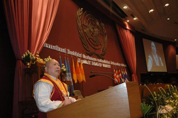 應 邀 在 聯 合 國 會 議 中 心 主 席 台 上 發 言 。 讚 頌
