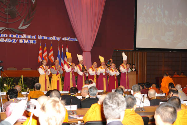 在 衛 塞 節 閉 幕 式 上 帶 領 中 國 漢 傳 密 宗 僧 伽 唱 頌 《 宇 宙 光 明 曲 》 。