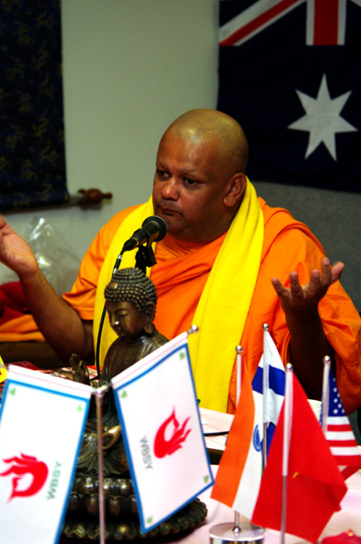薄 伽 梵 大 聖 智 及 維 摩 詰 阿 達 爾 嘛 佛 師 尊 : 長 老 們 : 您 們 好 。 今 天 我 很 高 興 參 與 這 個 法 會 。 我 代 表 世 界 佛 教 青 年 僧 伽 會 感 謝 師 父 和 聖 密 宗 金 剛 禪 佛 教 世 界 總 部 諸 位 為 世 界 佛 教 青 年 僧 伽 會 第 五 屆 大 會 的 成 功 而 努 力 。 此 會 議 本 來 是 計 劃 給 超 過 一 百 位 全 世 界 的 僧 伽 來 參 與 的 , 但 恰 巧 地 , 由 於 泰 國 機 場 的 關 閉 , 一 小 部 份 的 國 家 的 成 員 無 法 到 來 。 但 我 們 希 望 有 多 一 些 人 來 。 亞 洲 正 在 處 於 困 境 。 在 印 度 也 是 發 生 同 一 件 事 。 部 份 成 員 遇 到 簽 證 問 題 , 因 為 他 們 不 知 道 如 何 申 請 領 取 一 個 很 複 雜 的 簽 證 。 有 部 份 的 成 員 取 得 了 簽 證 , 但 有 部 份 無 法 到 來 。 師 父 明 白 情 況 的 。 我 代 表 他 們 為 無 法 出 席 會 議 而 向 師 父 道 歉 。 其 實 , 所 有 世 界 佛 教 青 年 僧 伽 會 成 員 都 和 師 父 有 很 好 的 關 係 的 , 也 懷 著 一 顆 熱 情 的 心 , 希 望 和 師 尊 相 見 。 其 實 , 我 們 都 是 在 一 起 的 , 我 們 都 在 弘 揚 佛 法 。 聖 密 乘 、 金 剛 乘 、 上 座 部 、 禪 宗 , 全 部 都 是 佛 教 徒 。 佛 教 徒 是 很 和 平 的 。 為 什 麼 佛 教 國 家 都 是 很 忍 辱 的 呢 ? 因 為 我 們 的 佛 祖 所 有 的 教 法 中 , 都 沒 有 教 導 人 們 暴 力 的 。 我 很 感 謝 師 父 及 師 父 的 弟 子 們 嚴 守 戒 律 。 我 們 十 分 之 感 謝 。 兩 年 前 , 師 父 及 部 份 的 聖 密 行 者 到 了 斯 里 蘭 卡 。 我 們 在 那 兒 舉 行 了 世 界 佛 教 青 年 僧 伽 會 第 三 屆 大 會 。 有 很 多 本 地 人 參 加 了 會 議 , 他 們 都 是 來 賓 。 那 個 大 會 有 很 多 國 家 的 代 表 參 與 的 。 會 議 過 後 , 我 問 本 地 的 人 : 「 哪 一 個 隊 伍 好 ? 您 們 喜 歡 哪 一 個 隊 伍 ? 」 所 有 人 都 異 口 同 聲 地 說 澳 洲 是 最 好 的 團 體 。 我 問 : 「 為 什 麼 ? 」 他 們 回 答 : 「 是 因 為 聖 密 宗 金 剛 禪 佛 教 的 生 活 習 慣 及 戒 律 好 。 」 他 們 不 是 僧 人 來 的 , 而 是 老 百 姓 ; 他 們 說 聖 密 宗 金 剛 禪 佛 教 是 最 佳 的 隊 伍 。 這 是 當 地 本 地 的 人 民 獨 立 的 評 價 。 聖 密 宗 金 剛 禪 佛 教 對 他 們 而 言 是 新 認 識 的 教 派 。 但 師 父 及 聖 密 宗 金 剛 禪 佛 教 行 者 有 著 威 儀 及 良 好 的 人 格 。 這 是 一 個 很 好 的 佛 教 , 一 切 一 切 也 來 源 於 師 父 。