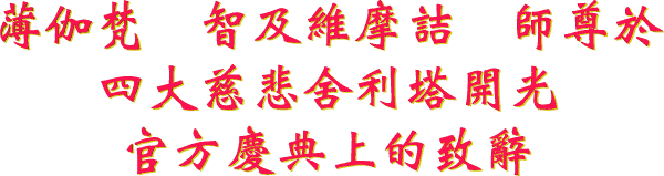| 這 位 青 年 也 是 從 地 面 層 的 最 後 面 , 飛 跑 到 舍 利 塔 頂 層 。 此 時 , 大 聲 地 對 薄 伽 梵 智 及 維 摩 詰 師 尊 請 求 道 : “ 我 學 密 宗 的 聖 緣 終 於 成 熟 ! 我 苦 苦 等 了 十 幾 年 , 終 於 等 到 了 您 大 師 。 ” 〔 金 剛 禪 欣 〕 |